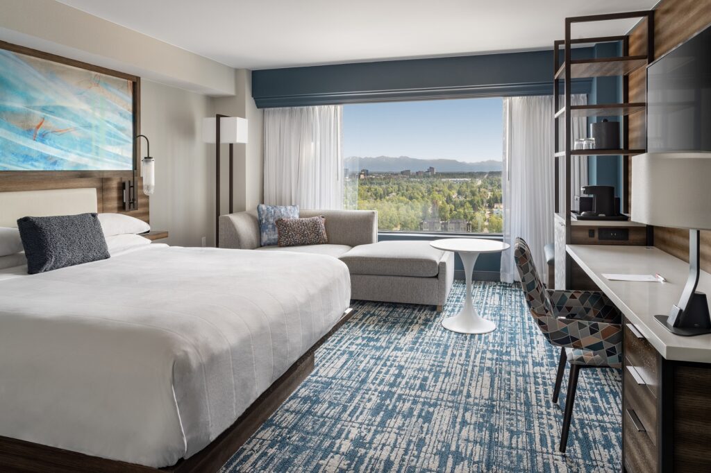 Positioned just five miles from the Anchorage Airport in Alaska, and near the Anchorage train station, Marriott Anchorage Downtown boasts an enviable location in downtown Anchorage. Whether awaiting your cruise ship at the nearby port, attending a conference in downtown Anchorage or exploring the Alaskan countryside, our Anchorage hotel near the train station offers spacious rooms for a relaxing stay in Alaska. Picturesque city and mountain views will greet you when you rise and plush beds facilitate a restful sleep. Begin your morning with a freshly brewed cup of coffee and a buffet breakfast at our Cafe Promenade, also open for dinner, and take advantage of free Wi-Fi throughout our hotel in downtown Anchorage, Alaska. Offering valet parking, our hotel is home to six event venues, a fitness center and an indoor pool. Our location within walking distance of the bus and train station makes getting around the city a breeze. Join us at Marriott Anchorage Downtown for a successful stay in Alaska.